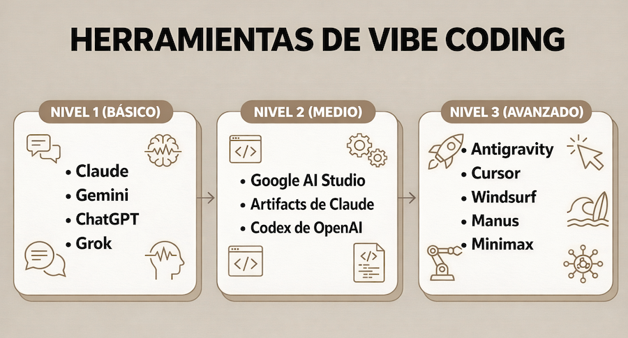 En este nivel, surgen herramientas específicamente pensadas para trabajar con proyectos completos y no solo con fragmentos de código. Entornos como Cursor o Windsurf funcionan como editores de desarrollo asistidos por IA: entienden el conjunto del repositorio, permiten navegar por los archivos, proponer cambios coherentes en varias partes del proyecto y ejecutar o depurar el código sin salir del entorno. Junto a ellos, plataformas más orientadas a agentes como Manus o Minimax dan un paso más en automatización: no se limitan a responder instrucciones puntuales, sino que planifican subtareas, encadenan acciones y ejecutan flujos completos de trabajo. En conjunto, estas herramientas están pensadas para reducir la fricción de trabajar con proyectos reales, largos y con múltiples piezas, acercando la programación asistida con IA a un uso continuado y no sólo experimental.
