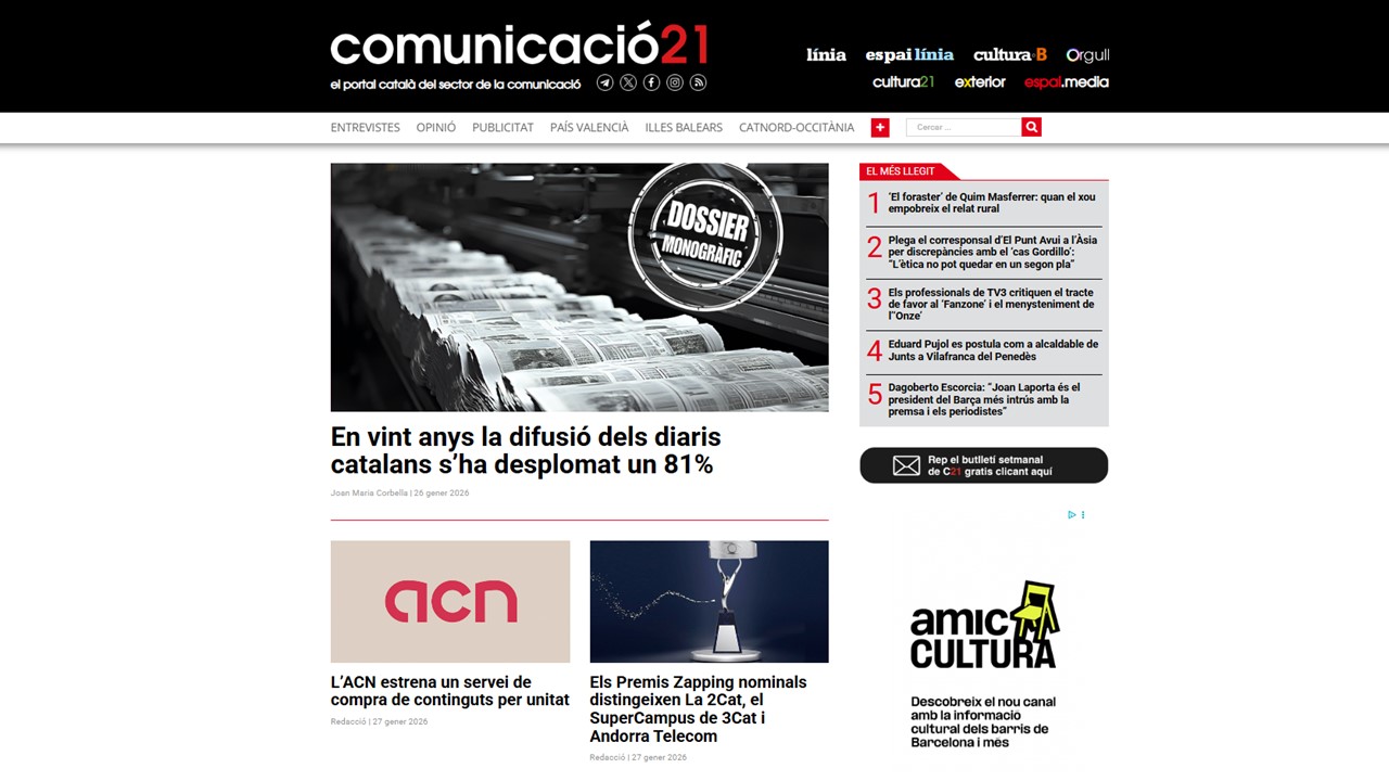 R. En primer lugar, es de justicia poner en valor el empeño y la visión periodística y empresarial del editor del Grup Comunicació 21, David Centol. Con él, empezó todo. Tras más de 25 años de recorrido, la cabecera madre -Comunicació 21- ha ido de menos a más y ha tenido la suerte de consolidarse, aparte de la revista que edita el Col·legi de Periodistes de Catalunya, como único portal en catalán dedicado exclusivamente al sector. No queremos perder la esencia de Comunicació 21, que es tener la oportunidad de difundir noticias y entrevistas a los actores principales del sector. Hoy el Grup Comunicació 21 es una marca reconocible, también, por sus distintas cabeceras temáticas. Desde la más antigua -Comunicació 21- hasta la más reciente -CulturaB-. Pero el Grup Comunicació 21 es mucho más.