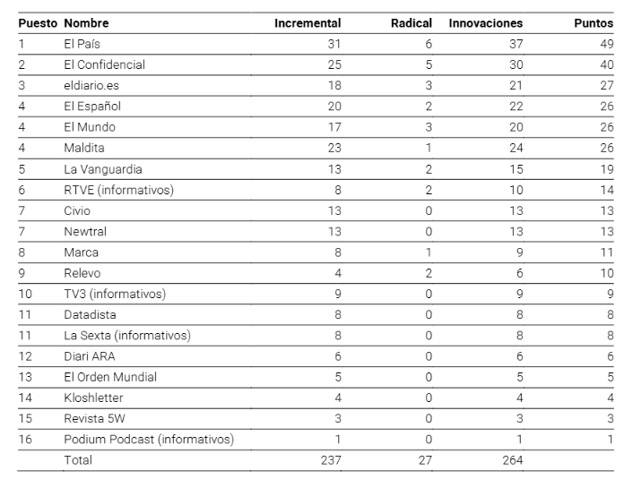 El ranking dibuja un ecosistema heterogéneo en el que conviven medios tradicionales, nativos digitales, proyectos especializados y nuevas iniciativas. Sin embargo, la principal diferencia con respecto a 2014 es el protagonismo de los medios consolidados, cuya presencia antes era mínima. Mientras que en la anterior edición la innovación procedía de los márgenes de la industria, ahora los grandes han asumido la innovación como parte de su estrategia estructural.