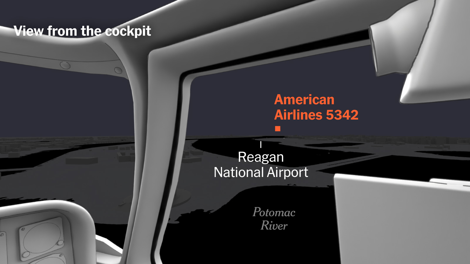 Este modelo en 3D creado por The New York Times permite visualizar el campo de visión de los pilotos del helicóptero Black Hawk ,momentos antes de que un avión regional de American Airlines y el helicóptero del ejército colisionaran en el Aeropuerto Reagan de Washington en enero de 2025.La animación en tiempo real muestra los tres minutos previos a la colisión. El usuario no solo ve el choque, se sitúa físicamente en la cabina de los pilotos justo antes del impacto. La animación en tiempo real que simula la visión nocturna permite comprender la “multitud de errores sistémicos” que ocasionaron la tragedia. Sentir la tensión de esos tres minutos finales crea una conexión empática que ninguna crónica podría igualar. Un interactivo de Helmuth Rosales, K.K. Rebecca Lai, Mika Gröndahl y John Ismay.