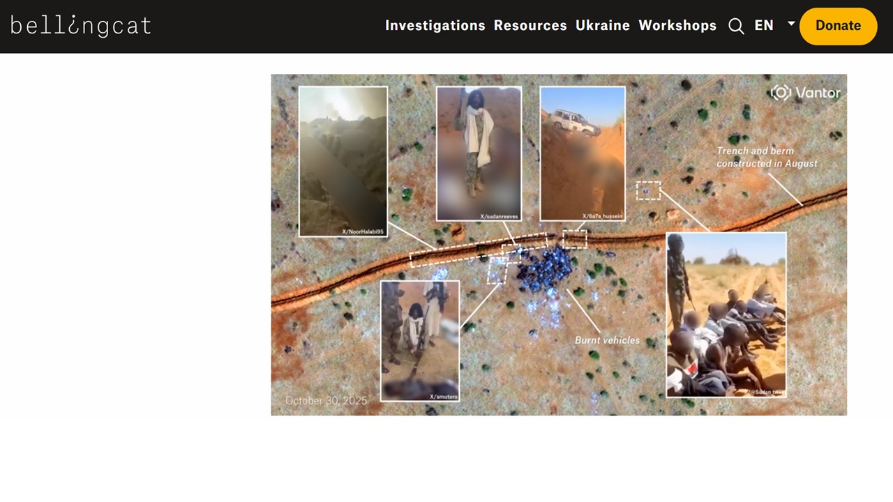 A partir de videos grabados por testigos, imágenes satelitales y redes sociales, en Bellingcat reconstruyen dónde y cómo ocurrieron ataques contra civiles que huían de la violencia en la región de Darfur, en Sudán. La investigación guía al lector por el proceso de verificación: compara elementos del paisaje, analiza estructuras y sitúa los hechos en mapas detallados, para demostrar la ubicación exacta de los eventos, aportando evidencia visual sobre posibles crímenes de guerra. Emplea técnicas de inteligencia de fuentes abiertas (OSINT) aplicadas al periodismo. El trabajo muestra las evidencias de forma transparente, permitiendo al lector seguir y entender el proceso de investigación. La combinación de geolocalización, análisis forense digital y narrativa interactiva refuerza la credibilidad y refuerza el papel del periodismo como herramienta de verificación en contextos de conflicto, donde el acceso directo es limitado y abunda la desinformación. Un interactivo de Sebastian Vandermeersch y Merel Zoet.