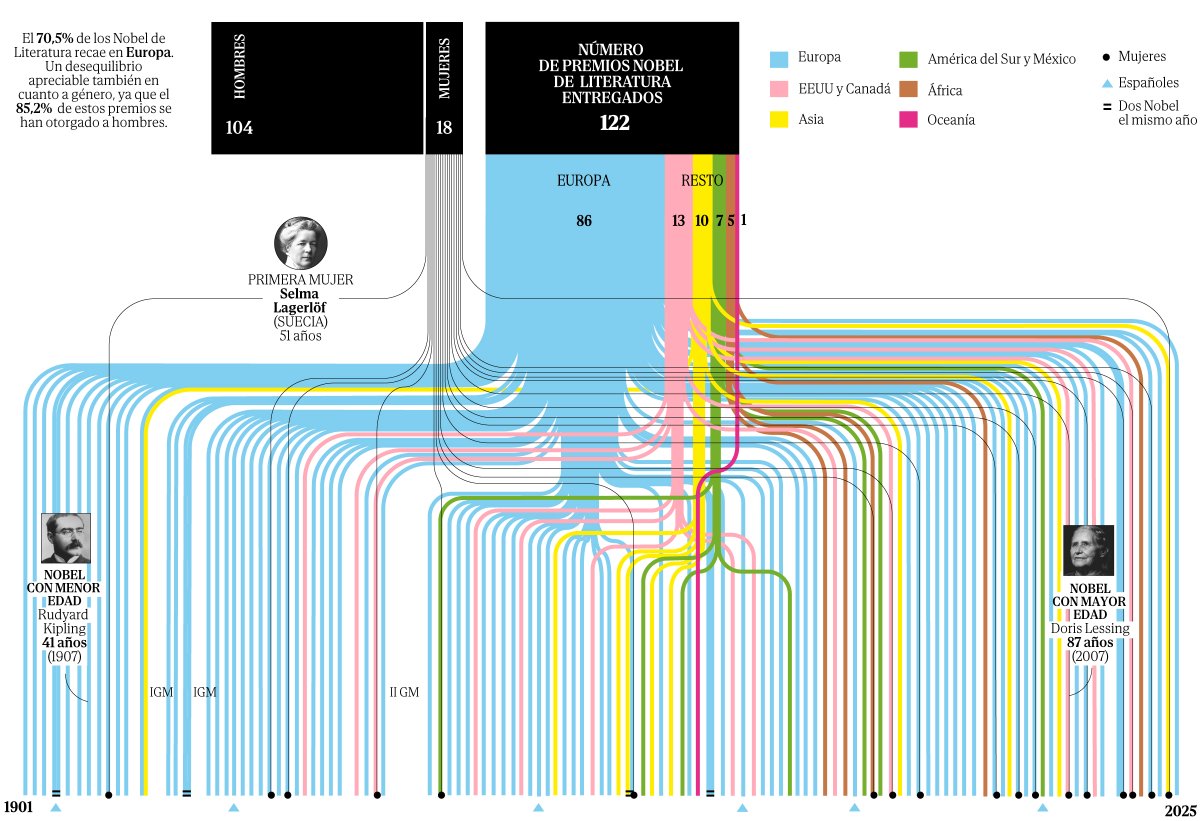 Si juntas 122 Premios Nobel de Literatura y los analizas, los resultados son incontestables: más del 70% de los galardones se han otorgado a Europa, más del 80% a hombres y ninguna lengua africana está representada. Me encanta esta “radiografía del poder en la historia de la humanidad”. En los primeros 103 años, solo lo recibieron nueve mujeres, un ocho%, y desde 2004 hasta hoy, las otras nueve, un 41%. Hay104 Premios Nobel para ellos y 18 para ellas. “Igualdad, igualdad, en sentido matemático estricto, sería que los próximos 86 galardones recayeran solo en mujeres”, sostienen las autoras. La narrativa usa la frialdad de los datos para cuestionar un panteón cultural sagrado. Transforma un tema puramente literario en un análisis estadístico y social, mostrando la brecha histórica. Es un ejercicio de honestidad para entender el mundo actual. Infografía y texto de Isabel González, con datos de Irene Merayo.