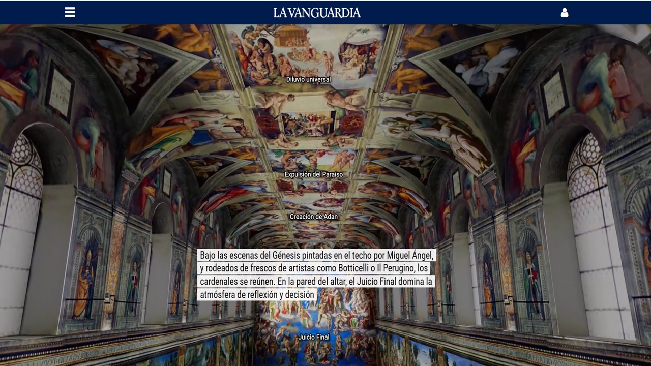 La pieza guía al lector en cada etapa del cónclave: desde la convocatoria de los cardenales y su encierro en la Capilla Sixtina, hasta las votaciones sucesivas y la tradicional fumata blanca que anuncia la elección del nuevo pontífice. A lo largo del recorrido, se combinan textos explicativos con ilustraciones, esquemas y elementos interactivos que permiten entender las reglas, los rituales y el simbolismo de un proceso históricamente hermético. El carácter innovador de la narrativa reside en su capacidad para transformar un procedimiento complejo y poco accesible en una experiencia clara y comprensible. Mediante recursos visuales dinámicos, animaciones y una navegación guiada, el usuario recorre el proceso paso a paso. Elaborado por María-Paz López(Textos), Pablo González, Anna Belil, Natalia Palazón y Mario Chaparro(Infografía).